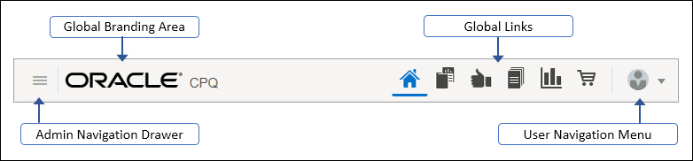 Administrators can modernize the appearance and usability of Oracle CPQ navigation with the Oracle Alta UI system. Once activated, a new Global Header replaces the previous header and navigation links with a customizable branding area, Global Links, User Navigation Menu, and Admin Navigation Drawer.